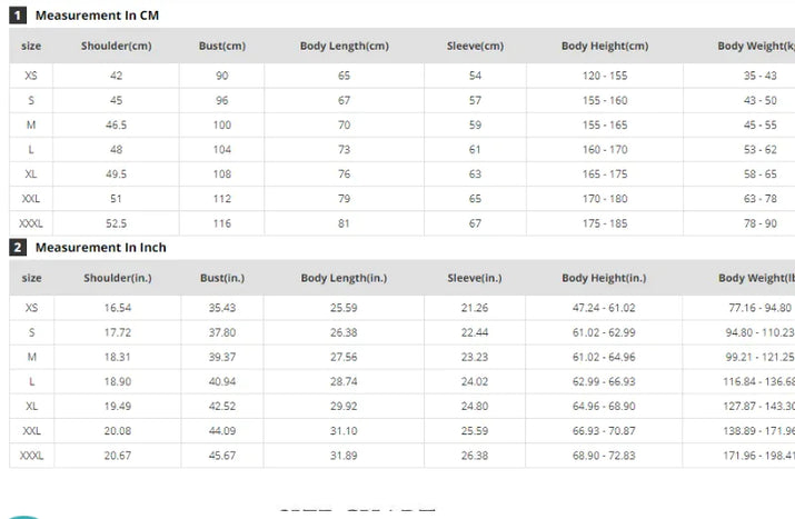 Answer 1: The shirt is available in four sizes: Small (bust 44.5 in, shoulder 24.8 in), Medium (bust 46.8 in, shoulder 25.9 in), Large (bust 49.1 in, shoulder 27.1 in), and XL (bust 52.3 in, shoulder 28.7 in).